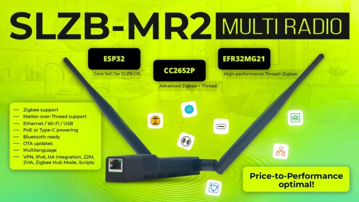 De SLZB-MR2 is een nieuwe generatie Zigbee en Thread coördinator ontwikkeld door SMLIGHT. Het combineert de 2 nummer 1 chips van de SLZB familie en wel de Texas Instruments CC2652P (SLZB-06) en Silicon Labs EFR32MG21 (SLZB-06M) chips. Hierdoor volledige compatibiliteit met Zigbee2MQTT, ZHA en Matter-over-Thread mogelijk is.