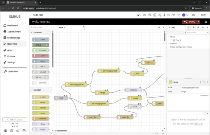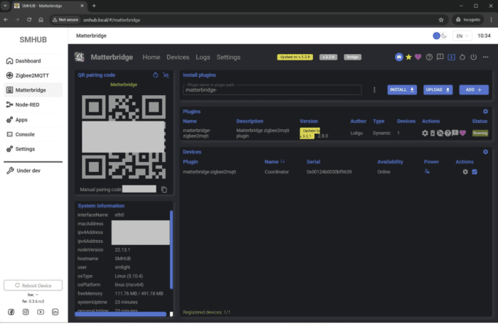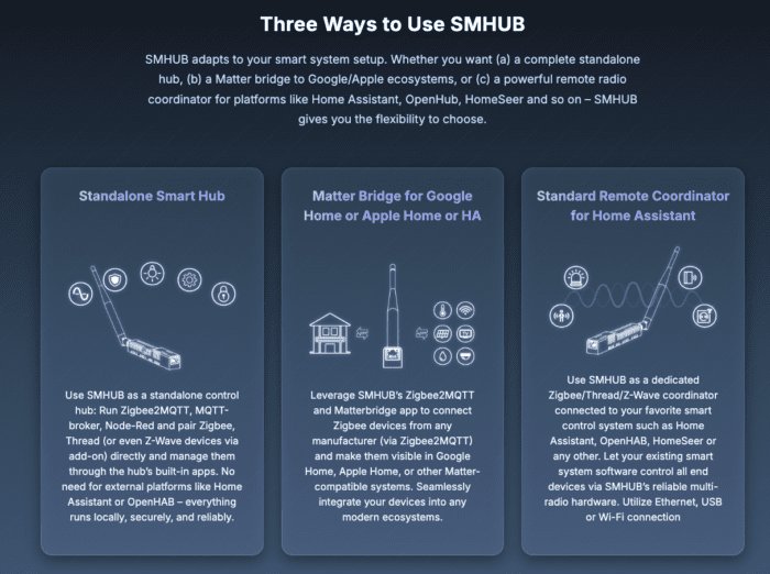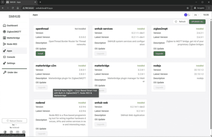 Dankzij de geïntegreerde ondersteuning voor Zigbee2MQTT, Node-RED, MQTT, WireGuard en OpenThread fungeert de SMHUB Nano Mg24 als een volwaardige centrale controller voor moderne smart-home- en IoT-installaties. Met Matterbridge koppel je Zigbee-apparaten moeiteloos door naar Apple Home en Google Home, zodat je profiteert van Matter-compatibele ecosystemen zonder concessies.
